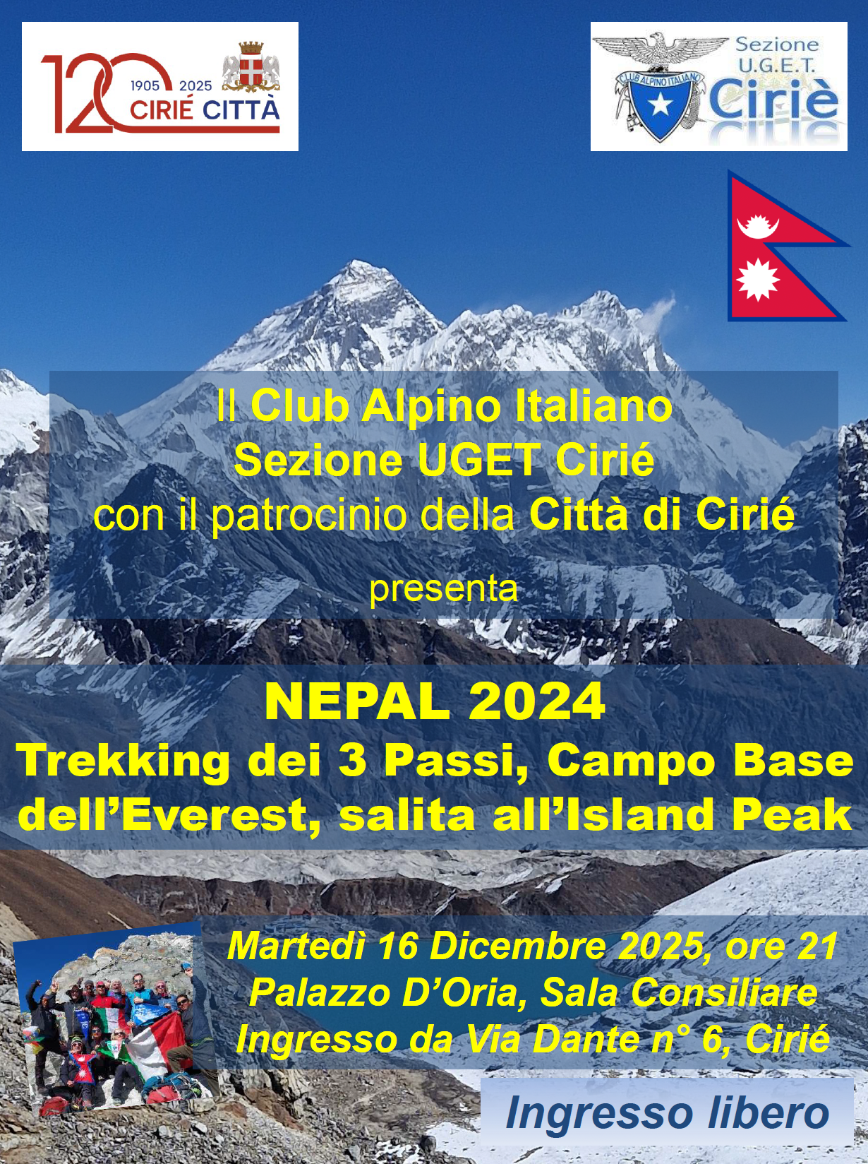 Martedì 16 dicembre, invece, nella Sala Consiliare di Palazzo D’Oria il CAI Uget Cirié alle ore 21.00 presenterà invece la serata “Nepal 2024” dedicata al Trekking dei 3 Passi, al campo base sull’Everest e alla salita all’Island Peak.