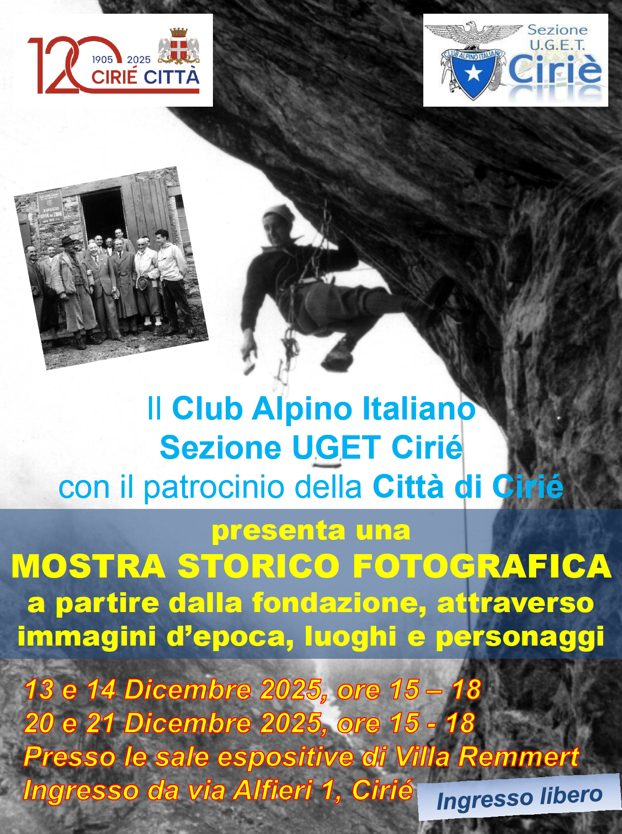 Il CAI – Club Alpino Italiano sezione UGET di Cirié ha organizzato diversi appuntamenti per questo dicembre. Il primo è la mostra storico fotografica che ripercorre la fondazione della sezione, con immagini d’epoca, luoghi e personaggi, ospitata nei locali di Villa Remmert, con ingresso da via Alfieri 1.
