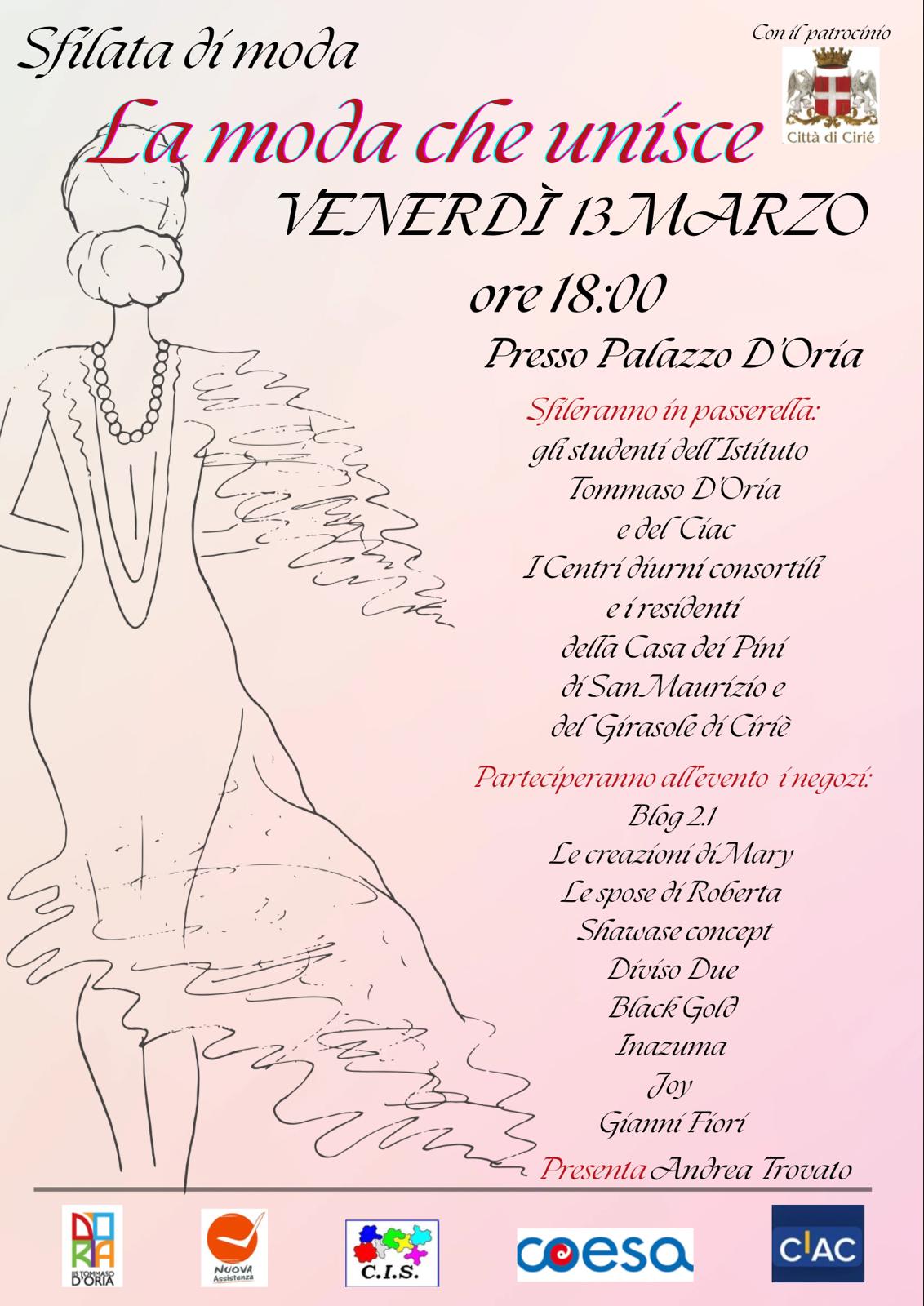 È stata organizzata per venerdì 13 marzo, alle ore 18.00, a Palazzo D’Oria la sfilata di moda dal titolo “La moda che unisce” che vedrà sfilare in passerella gli studenti dell’Istituto superiore Tommaso D’Oria e del CIAC, i centri diurni consortili e i residenti della Casa dei Pini di San Maurizio C.se e del Girasole di Cirié.